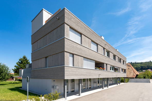 Dort, wo früher einmal ein Sägewerk war, steht heute eine neue Überbauung und strahlt im (sägerohen) Holzgewand. Die anspruchsvolle Architektur erforderte sehr detailintensive Arbeiten (z.B. zahlreiche vorgegebene Bezugslinien oder ein durchlaufendes Fugenbild). Die elegante Fassadenverkleidung des Massivbaus aus Stahlbeton und Mauerwerk besteht aus: Kreuzlattung ausgedämmt (Glaswolle) 160/180/200/220 mm, Winddichtung Weichfaser diffusionsoffen 18 mm, Hinterlüftungslattung, geschlossener Douglasien-Fassadenschalung 22 mm sowie Balkonbrüstungen in Douglasie mit durchlaufendem Fugenbild.