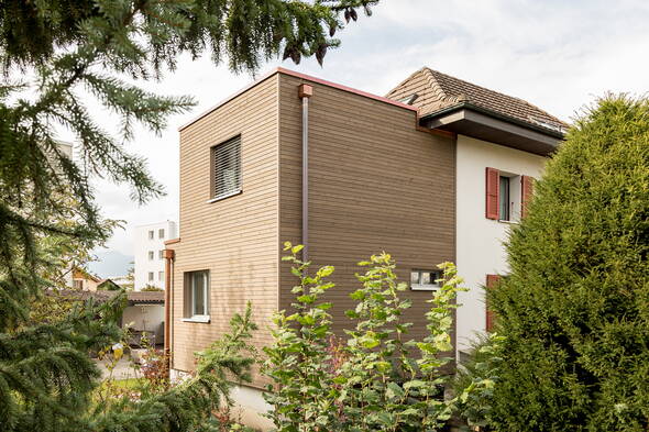 Der Anbau erforderte einen sorgfältigen Umgang mit dem bestehenden Blumengarten. Das Flachdach der Waschküche im Erdgeschoss wird neu als Terrasse genutzt. Die Berechnungen für ein Renditeobjekt erstellte Späti Architektur auf Wunsch der Familie.